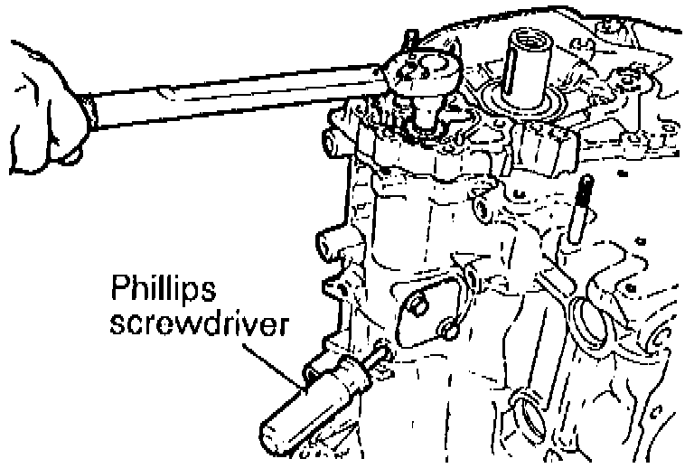 2. Keep silent shaft in position by inserting a screwdriver through plug hole in left side of cylinder block, Fig. 77. Remove oil pump driven gear flange bolt.