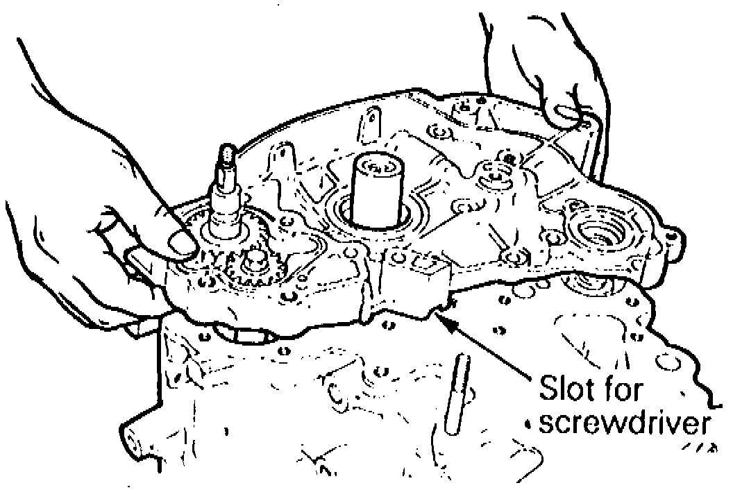 3. If front case is sticking to cylinder, insert a suitable screwdriver into slot and pry up, Fig. 78. Never attempt to pry at any other positions where flange is thinner. Avoid impacting front of case for removal.