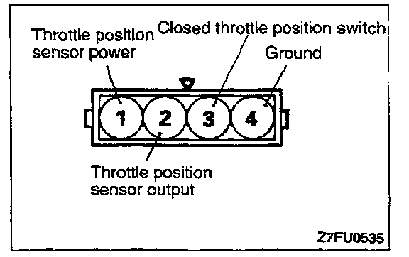 3. Connect a circuit tester between 4 (ground) and 2 (output), or between 2 (output) and 1 (power). Then, make sure that the resistance changes smoothly when the throttle valve is slowly moved to the fully open position.