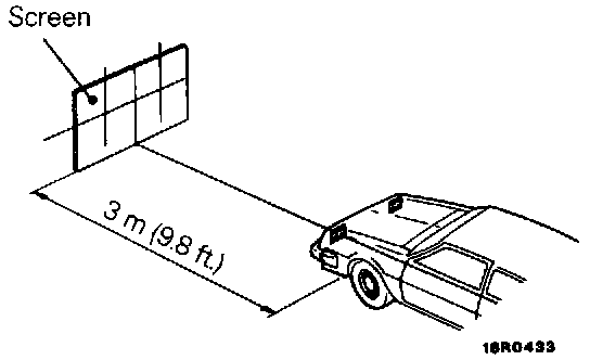 2. Place vehicle on a known level floor 3 m (9.8 feet) from aiming screen or light colored wall. Four lines of adhesive tape or like are required on screen or wall: