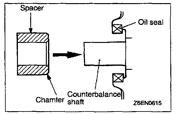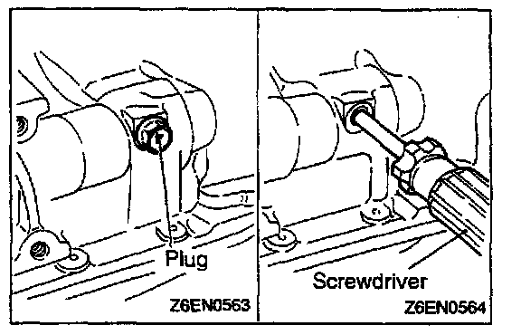 1. Insert a Phillips screwdriver [shank diameter 8 mm (.31 in.)] through the plug hole on the left side of the cylinder block to block the left counterbalance shaft.