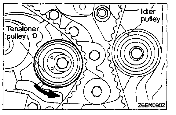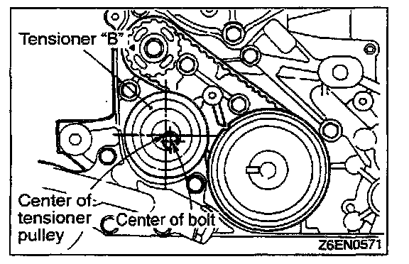 4. Move the tensioner "B" in the direction of arrow while lifting with a finger to give a sufficient tension to the tension side of timing belt. In this condition, tighten bolt to secure tensioner "B". When the bolt is tightened, use care to prevent shaft from turning together. If shaft is turned together, belt will be overtensioned.