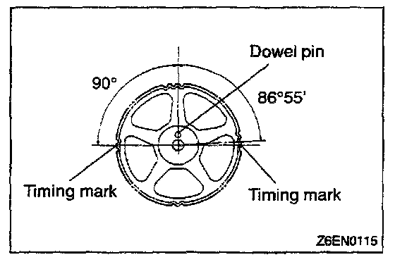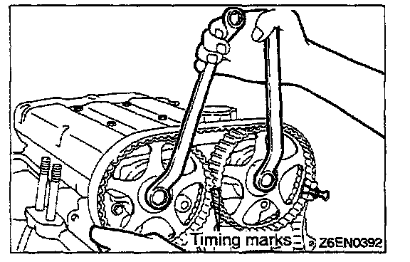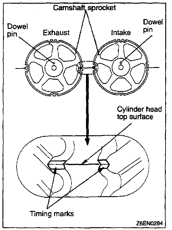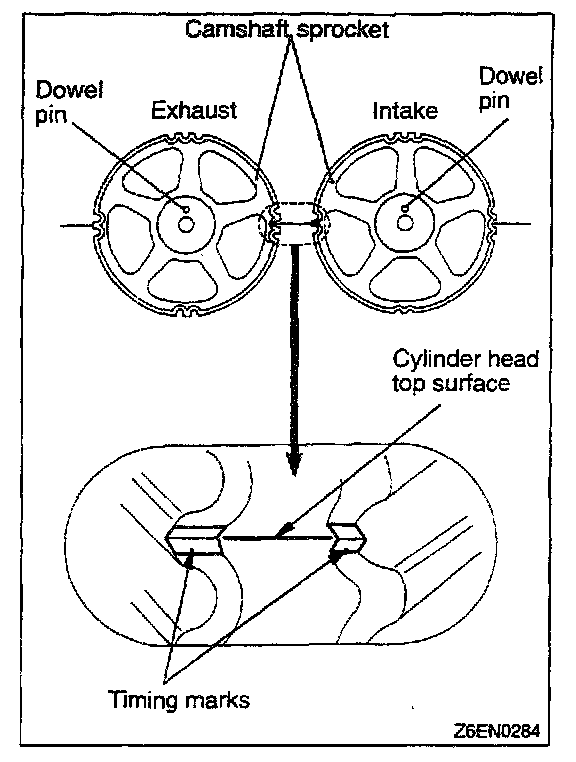 1. Turn the two sprockets so that their dowel pins are located on top. Then, align the timing marks facing each other with the top surface of the cylinder head. When you let go of the exhaust camshaft sprocket, it will rotate one tooth in the counterclockwise direction. This should be taken into account when installing the timing belt on the sprockets.