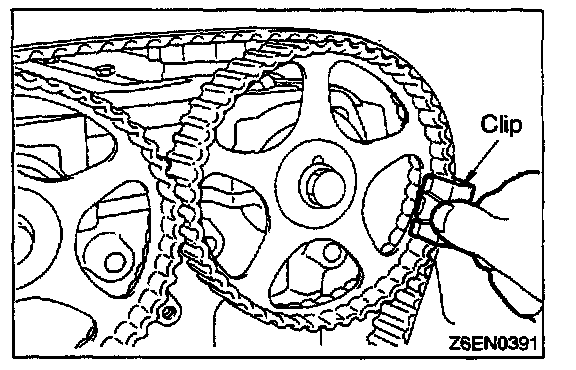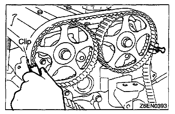 5. Thread the timing belt over the intake side camshaft sprocket and fix it at indicated position by a clip.