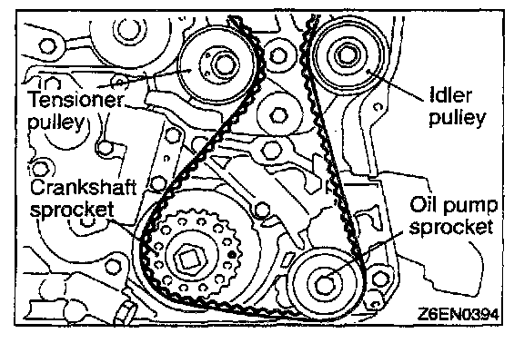 8. Thread the timing belt over the idler pulley, the oil pump sprocket, the crankshaft sprocket and the tensioner pulley in that order.