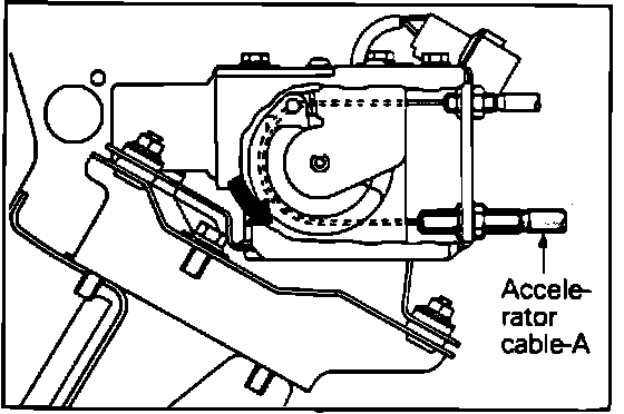 6. Next, adjust accelerator cable A (accelerator pedal side) at the adjustment point indicated. With the intermediate link A of the actuator held against the stopper, adjust the A cable to the standard clearance and tighten the locking nut.
