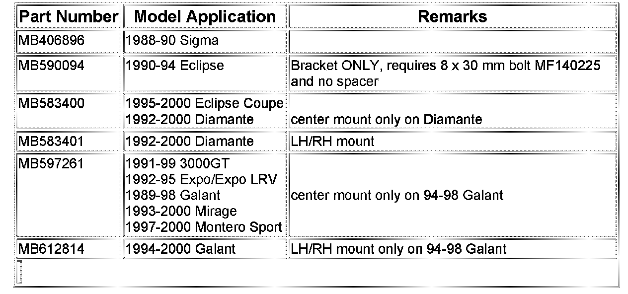 NOTE: Anchor kits are not available from MMSA for 3000GT Spyder, Cordia, Eclipse Spyder, 1988 and earlier Galant*, 1990 and earlier Mirage*, 2000 and earlier Montero, Mighty Max Truck, Precis*, Starion, Tredia*, and Van/Wagon models, however; vehicles noted (*) do have tether anchor holes. For these vehicles with the anchor holes, use the universal tether anchor kit included with the child safety seat, making sure a metric bolt is utilized. Universal kits cannot be installed on vehicles without the tether anchor holes. For more information, refer to the vehicle's owner's manual.