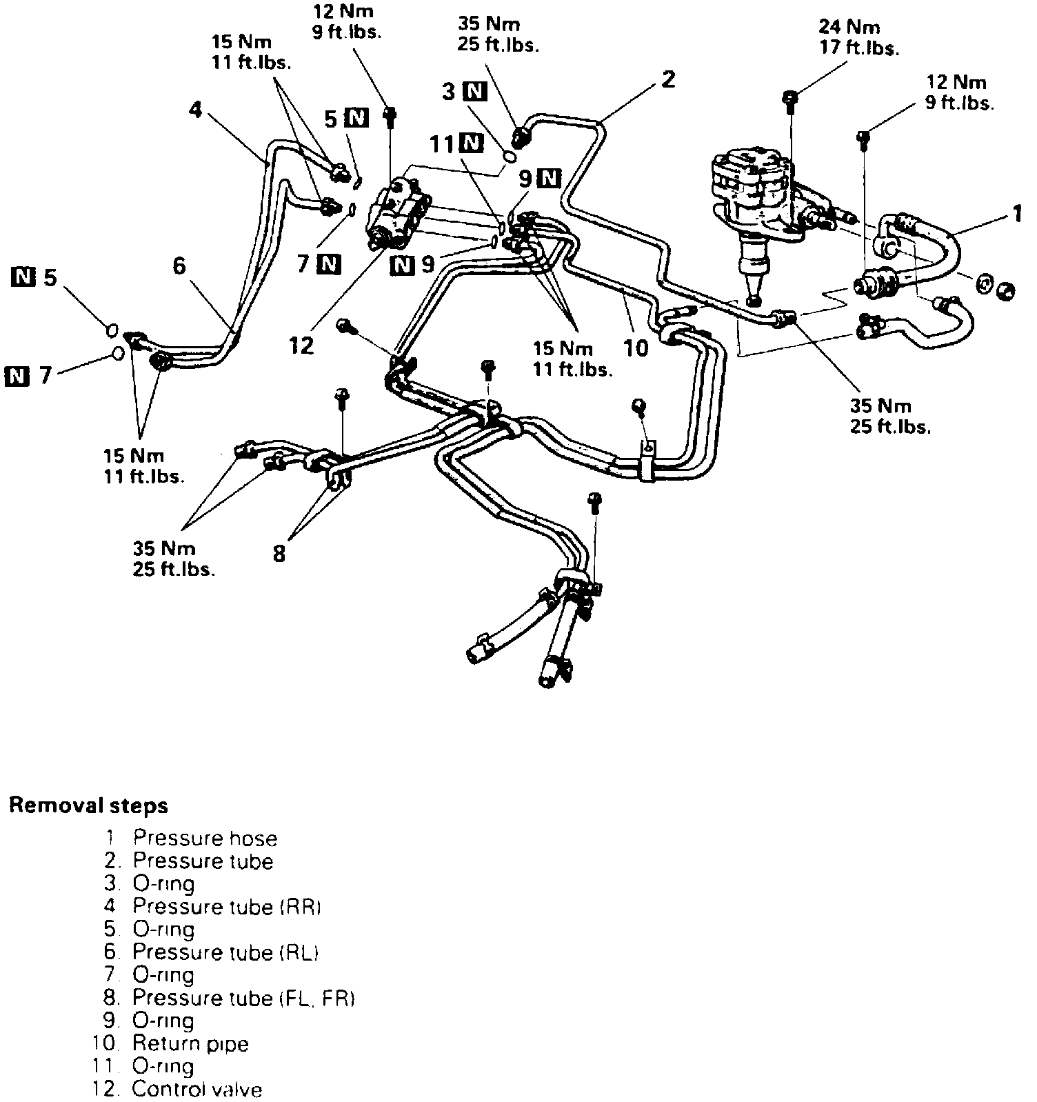 6. Reverse procedure to install, bleeding four wheel steering (4WS) system as outlined under Power Steering.