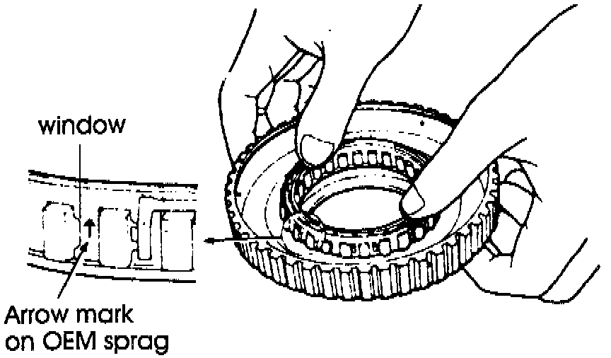 This condition may be caused by a sprag being installed backward. Many parts suppliers use the 700-R4 forward sprag to service the KM 175 series transaxle. Because of this, using the factory illustration for sprag installation will result in improper rotation of the sprag (figure 1).