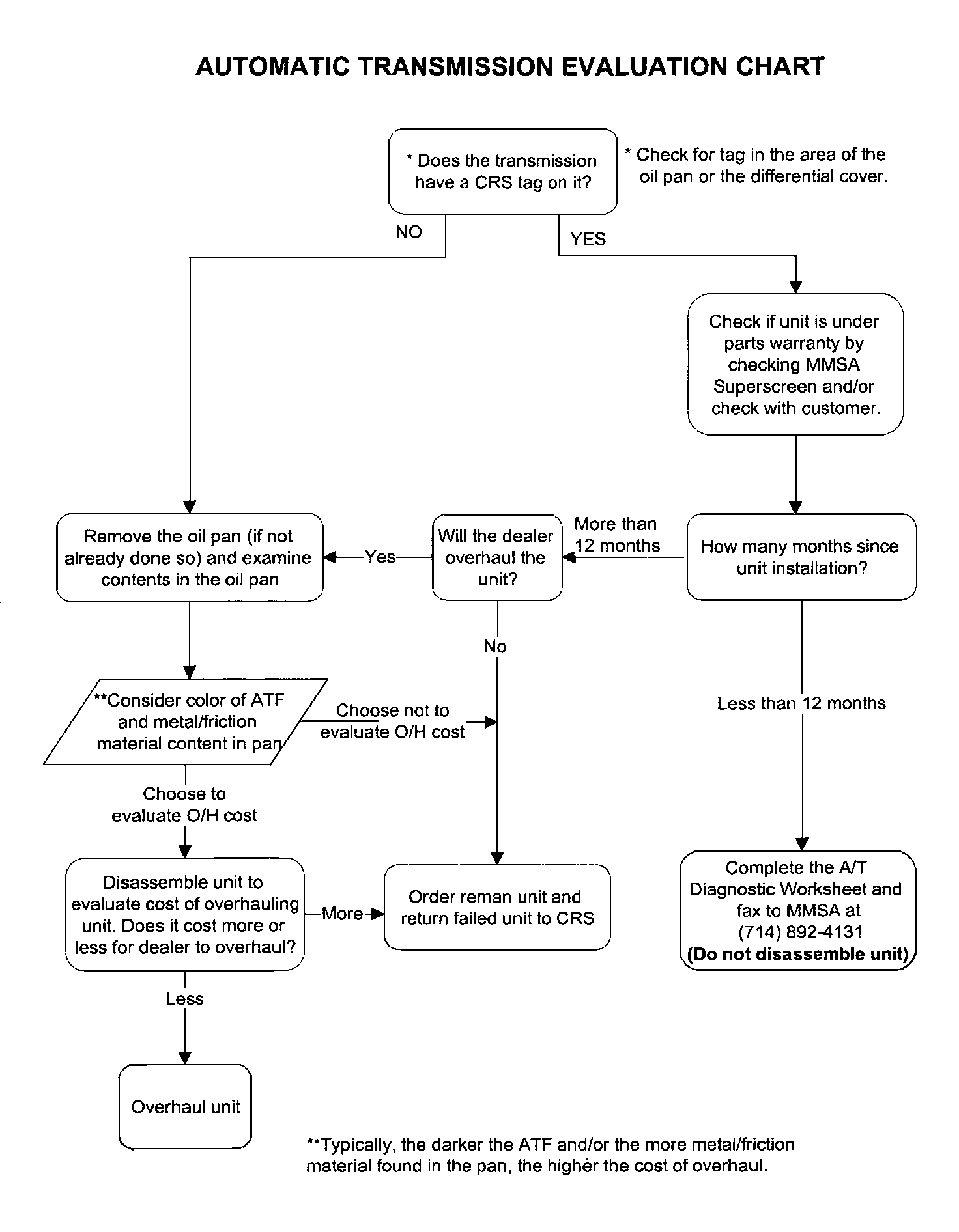 In a continuing effort to improve the quality of remanufactured transmissions, MMSA Quality Assurance Department is requesting dealers to identify CRS units that fail under the terms of the CRS 12-month/unlimited mileage warranty. Some replacement A/T units now include a brightly-colored notice asking it the new unit will replace a remanufactured A/T unit that failed within the terms of the parts warranty. It so, the dealer must complete A/T Diagnostic Worksheet (also included with the new unit) and the information at the bottom of the notice, and fax these documents to the MMSA Quality Assurance Department (714-892-4131).