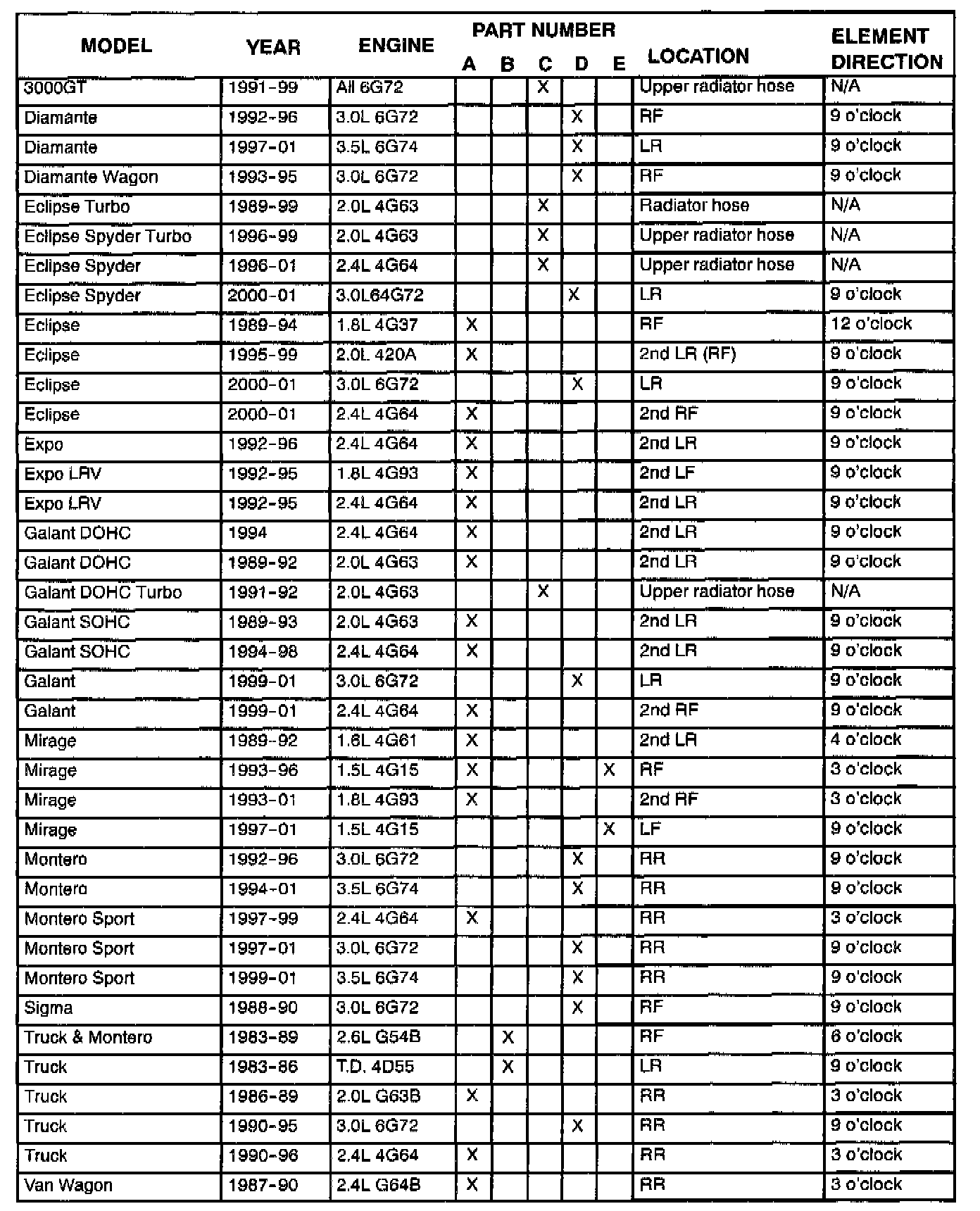 This bulletin provides specific vehicle application and general information on engine block heaters. The chart shown identifies the appropriate block heater kit, installation location, and positioning direction for most vehicles distributed by Mitsubishi Motor Sales of America, Inc.