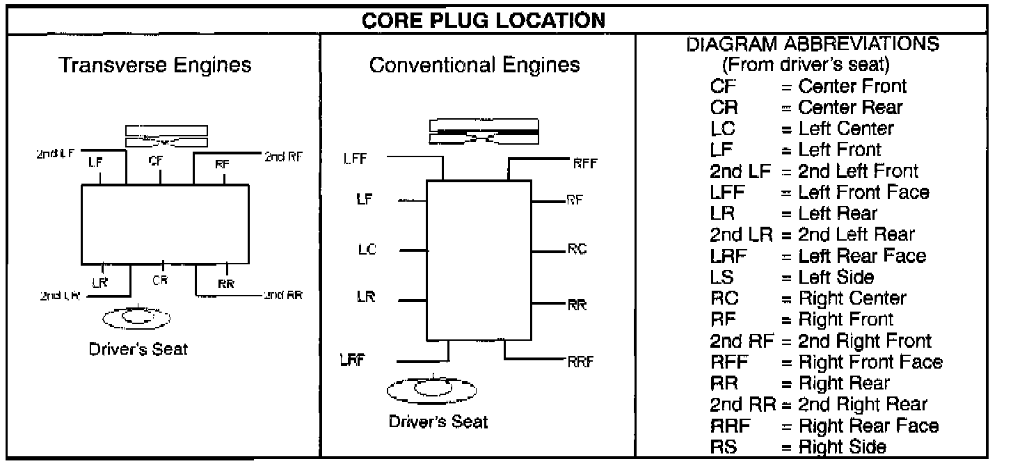 Refer to the illustrations along with the application chart in this bulletin to identify engine core plug locations and block heater installation position.