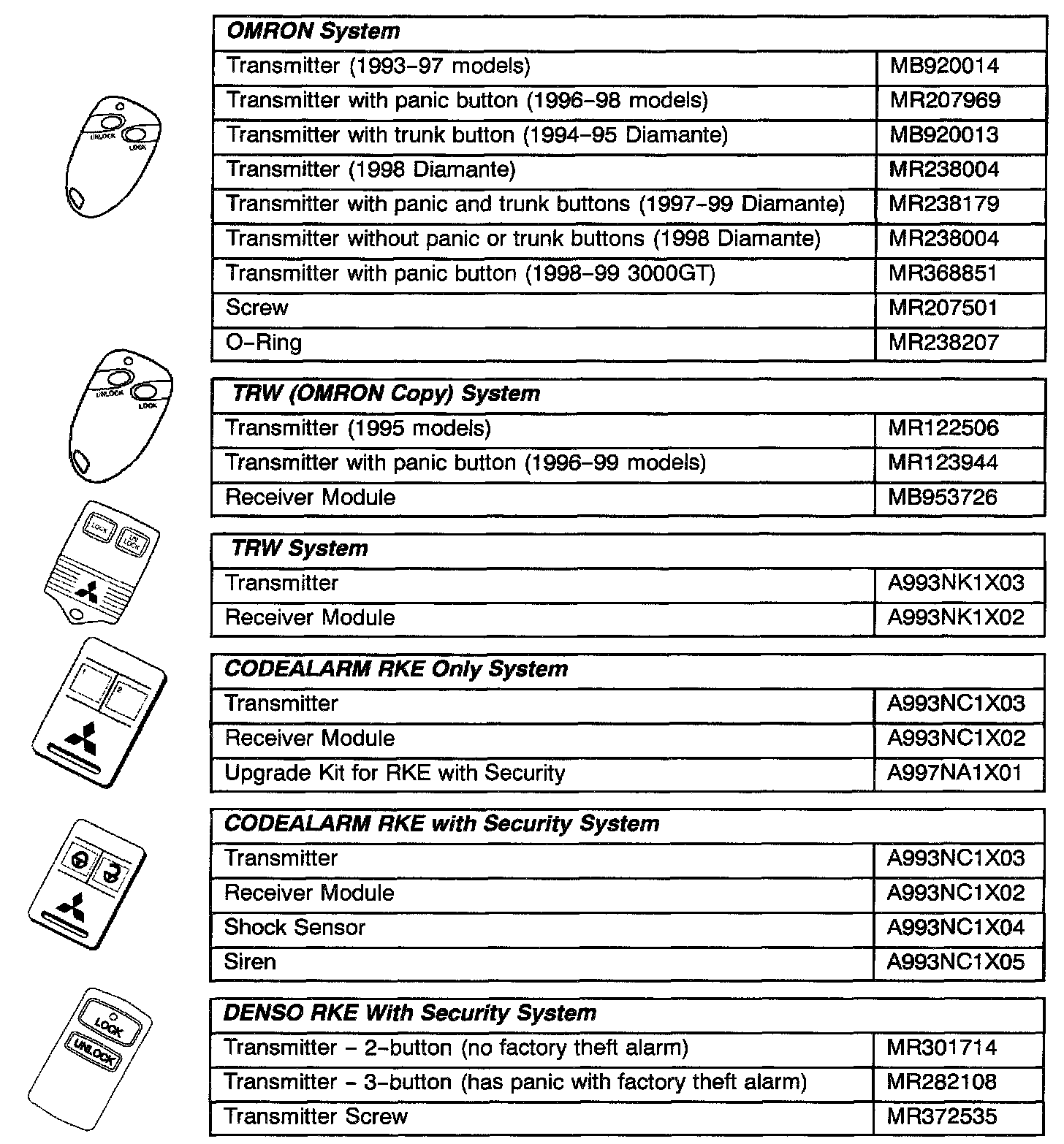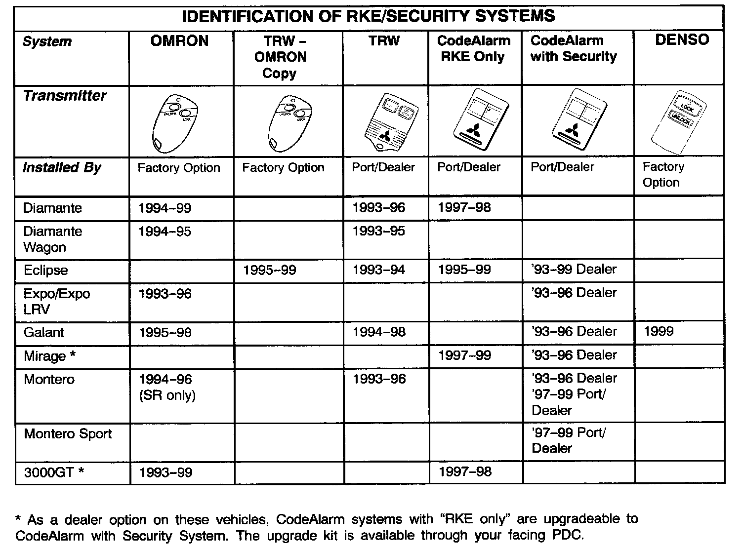Mitsubishi vehicles can have one of several types of remote keyless entry (RKE) systems installed, depending on vehicle model and model year. Some systems have only remote door lock operation, while others include an alarm system. Identify the system before attempting repairs. System operation, component location, and transmitter programming are different for each system. This bulletin contains basic service information for the various types of RKE systems. For detailed information on installing and troubleshooting RKE systems, contact your Regional Tech Line.