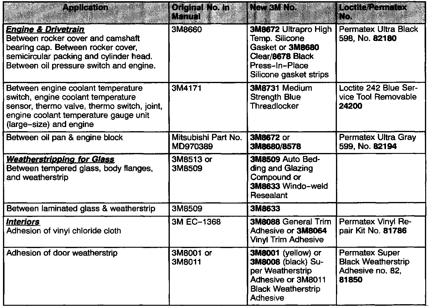Certain sealants, adhesives, and other chemicals are listed in Mitsubishi service manuals which may not be readily available through normal supply channels. The following table has interchange information for some of these popular items. The table lists 3M and Loctite(R)/Permatex(R) part numbers which are available in most areas of the country.