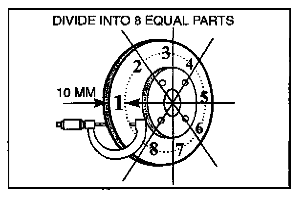 4. Using a micrometer, measure the disc thickness at the marks made in Step 3.