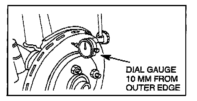 2. Position a dial gauge approximately 10 mm (0.40 in.) from the outer edge of the disc and zero the gauge. Measure the run-out. Run-out limit is 0.03 mm (0.0012 in.). The gauge reading should not exceed this limit.