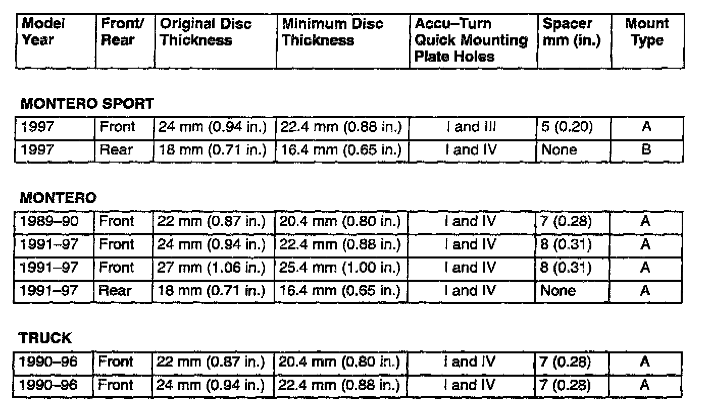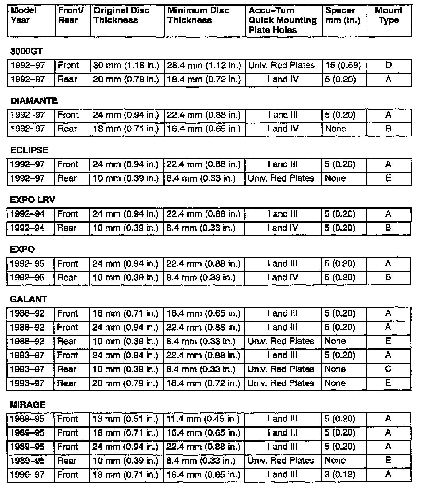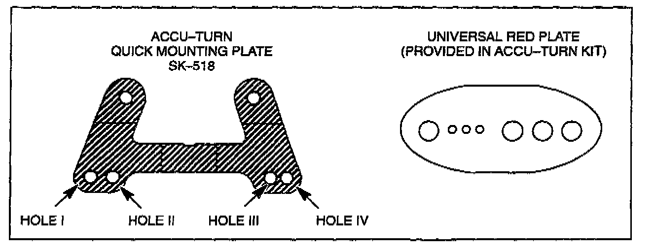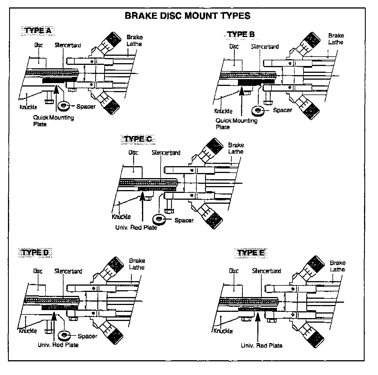 Accu-Tum quick mounting plate hole identification is shown later in this bulletin. Universal Red Plates are provided in the Accu-Tum brake lathe kit. Mount types are shown at the end of this bulletin.