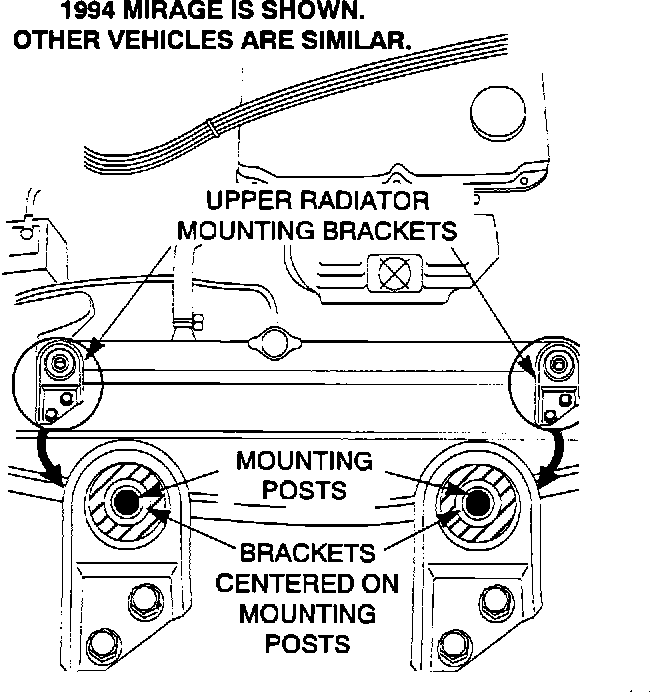 On some 1989 and later vehicles with 4-cylinder engines (mostly, vehicles equipped with automatic transaxle), the two upper radiator mounting posts may not be centered in their mounting brackets. Also, the two lower radiator mounting posts may not be fully seated in their brackets. If the radiator mounting posts are not properly installed, the radiator can transmit an engine vibration through the frame to the passenger compartment during vehicle idle.