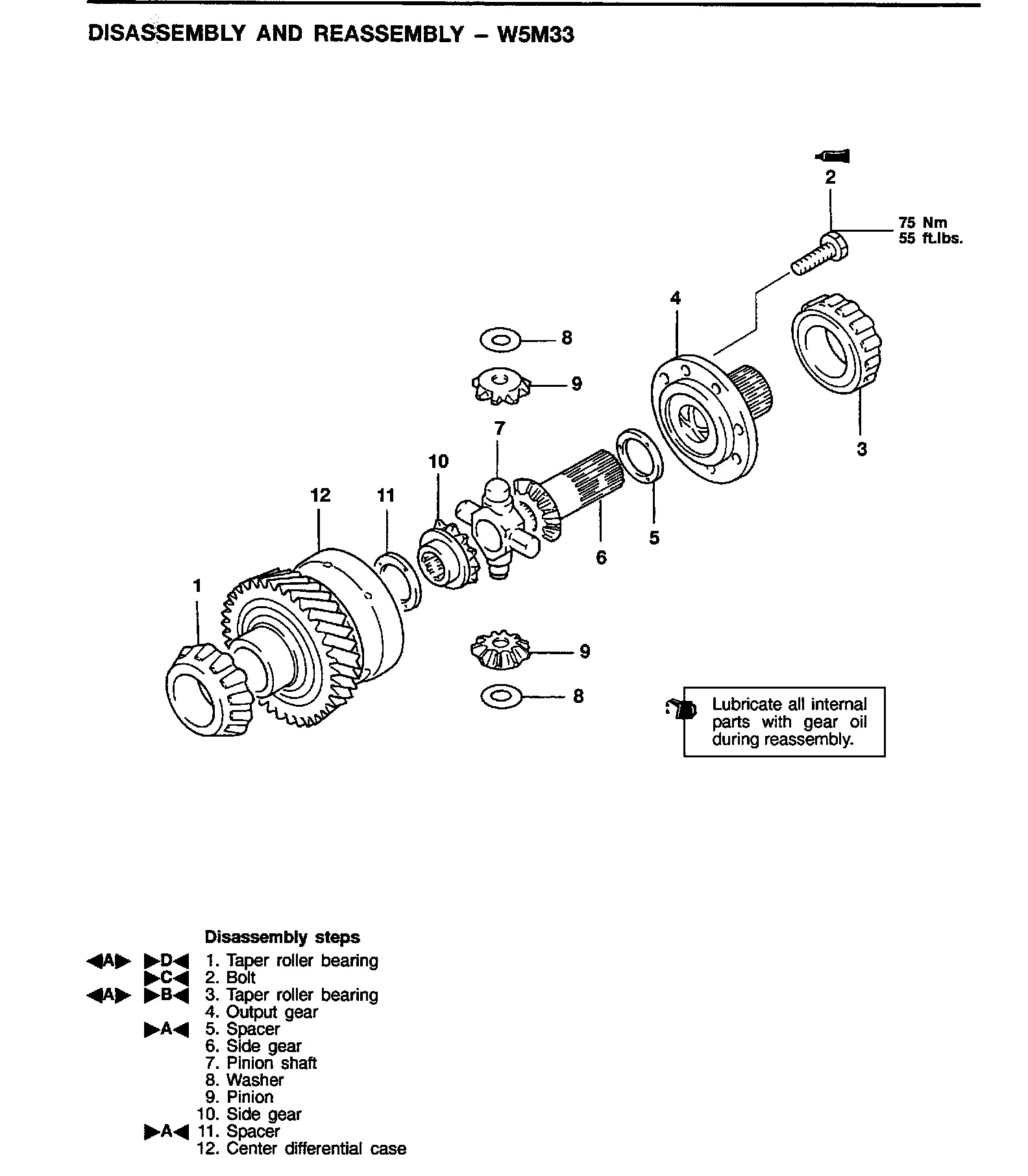 (3) Install the side gear, spacer, and output gear and tighten the bolt to specified torque.