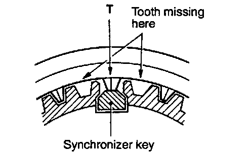 (2) The synchronizer sleeve has tooth missing at six portions. Assemble the hub to the sleeve in such a way that the center tooth "T" between two missing teeth will touch the synchronizer key.