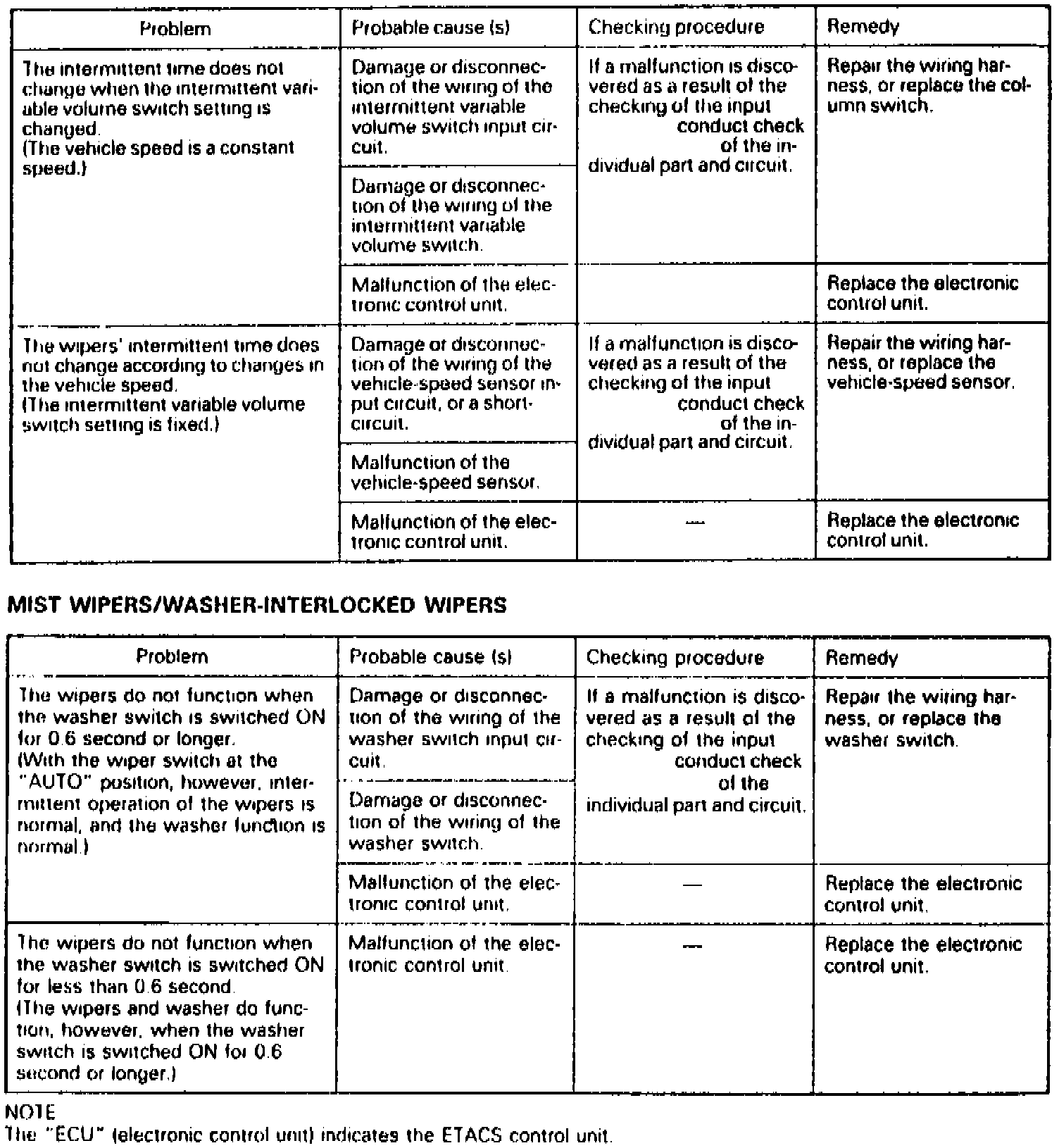 Refer to Fig. 1 and 2 when troubleshooting the ETACS wiper system.