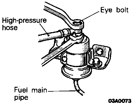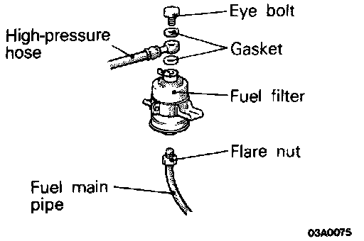 6. Holding the fuel filter nut, tighten the fuel main pipe's flare nut and eye bolt at the specified torque. Then tighten the filter to the bracket.