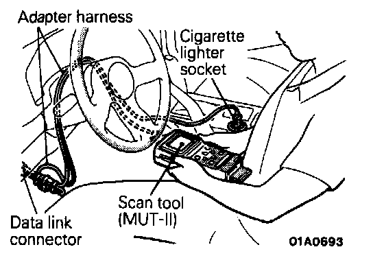 (2) Connect the scan tool to the data link connector using the adapter harness (included in the MUT-II sub assembly). If it is necessary to make the inspection while cranking the engine, use the battery harness to take power directly from the battery.