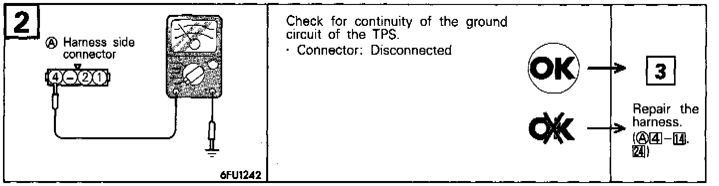 3. Connect a pointer type ohmmeter between terminal (4) (sensor ground) and terminal (2) (sensor output).