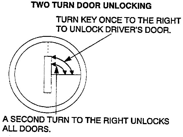 The two-turn door lock offers vehicle owners the option of unlocking just the driver's side door or all doors through a simple alteration of the key turning method. With all doors locked, here's how it works: