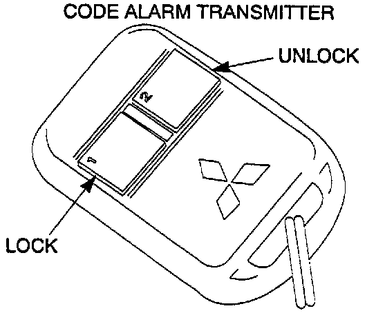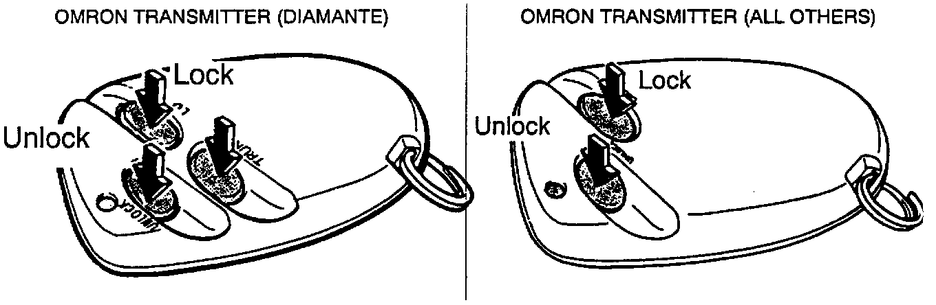 This is the only Factory installed RKE system. The system's transmitter can lock and unlock the vehicle doors. In addition, if the vehicle is equipped with the ETACS security system (Electronic Time and Alarm Control System), the transmitter can arm and disarm the security system. On the 1994 Diamante, the-transmitter has a third button which unlocks the trunk.