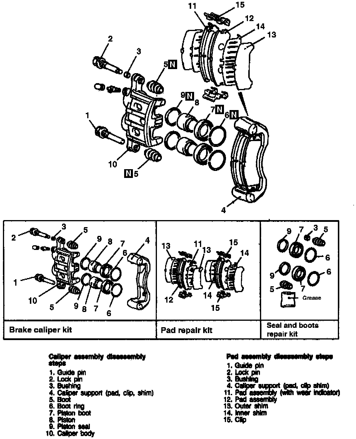 7. Apply a coating of suitable grease to the pad and anti-squeak shim contact surface and to the anti-squeak shim and inner shim contact surface. Ensure grease does not come in contact with brake pad assemble.
