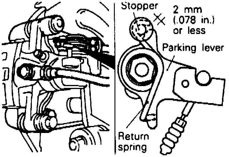10. With engine running, forcefully depress brake pedal five to six times and ensure the stroke of the parking brake lever is 0.078 inch or less, Fig. 6.