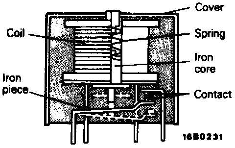 1. When current flows through the coil of a relay, its core is magnetized to attract the iron piece, closing (ON) the contact at the tip of the iron piece. When the coil current is turned off, the iron piece is made to return to its original position by a spring. opening the contact (OFF).
