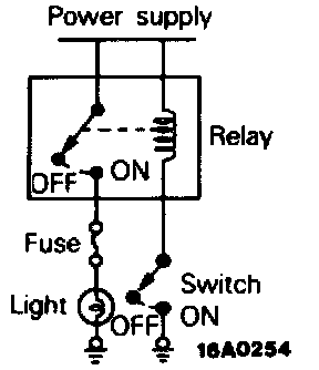 2. By using a relay, a heavy current can be turned on and off by a switch of small capacity. For example, in the circuit shown here. when the switch is turned on (closed), current flows to the coil of the relay. Then, its contact is turned on (closed) and the light comes on. The current flowing at this time to switch is the relay coil current only and is very small.
