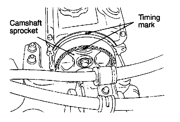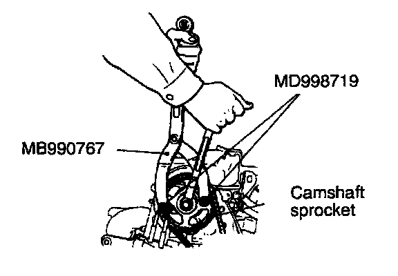 6. Make sure timing marks are aligned and, using SSTs (MB990767 and MD998719) or equivalent, install cam sprocket, torque to 88Nm (65 ft.lbs).