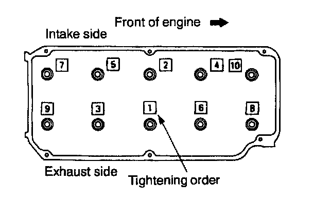 5. Install valve cover gasket, self-locking nuts and valve cover. Torque valve cover bolts to 3 - 3.5 Nm (2.2 - 2.5 ft.lbs).