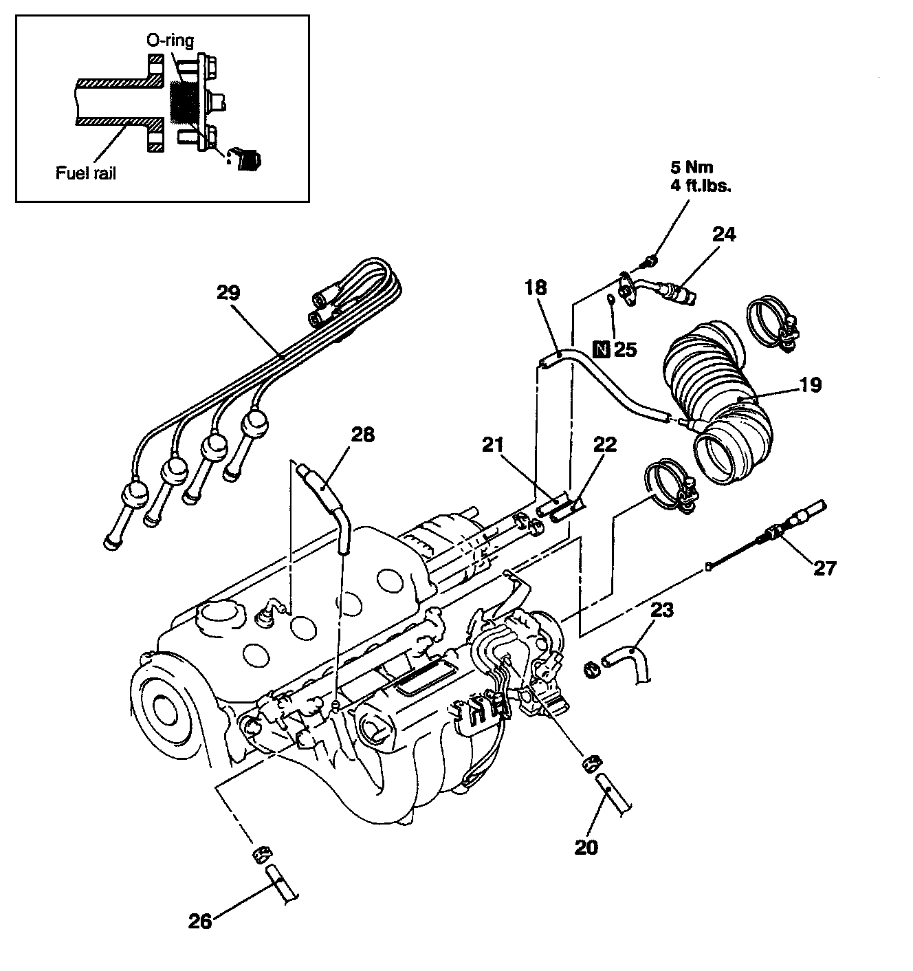 13. Remove the high-pressure fuel hose connection (24), O-ring (25), and the fuel return hose connection (26).