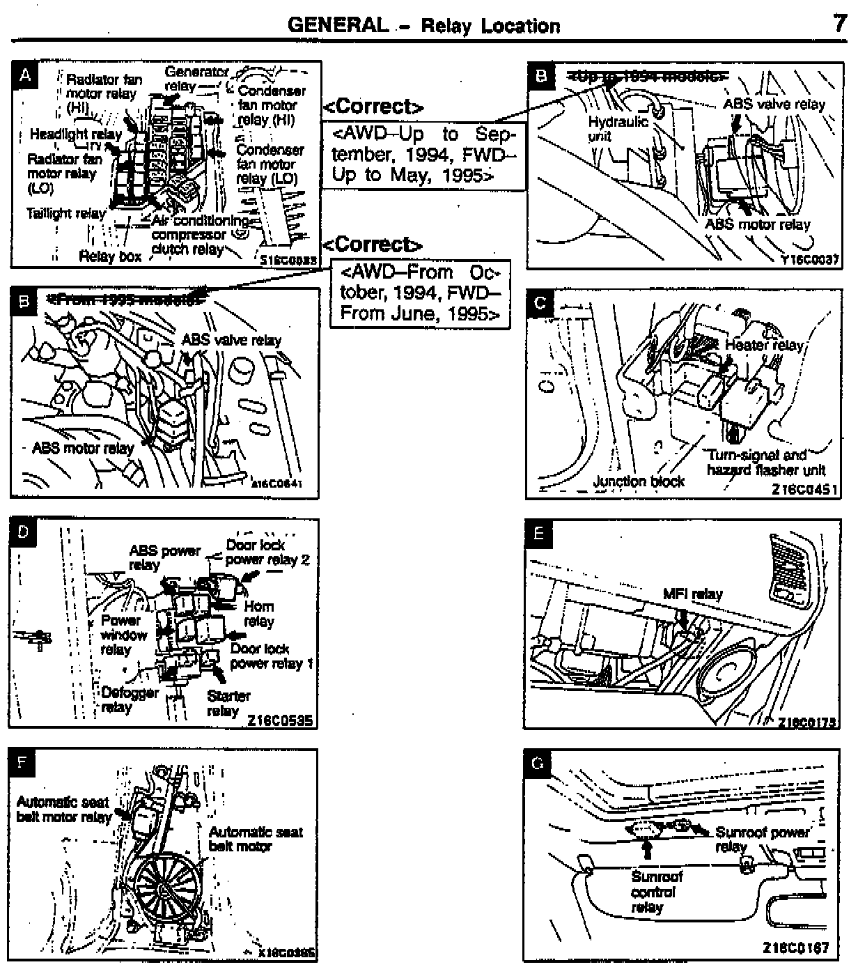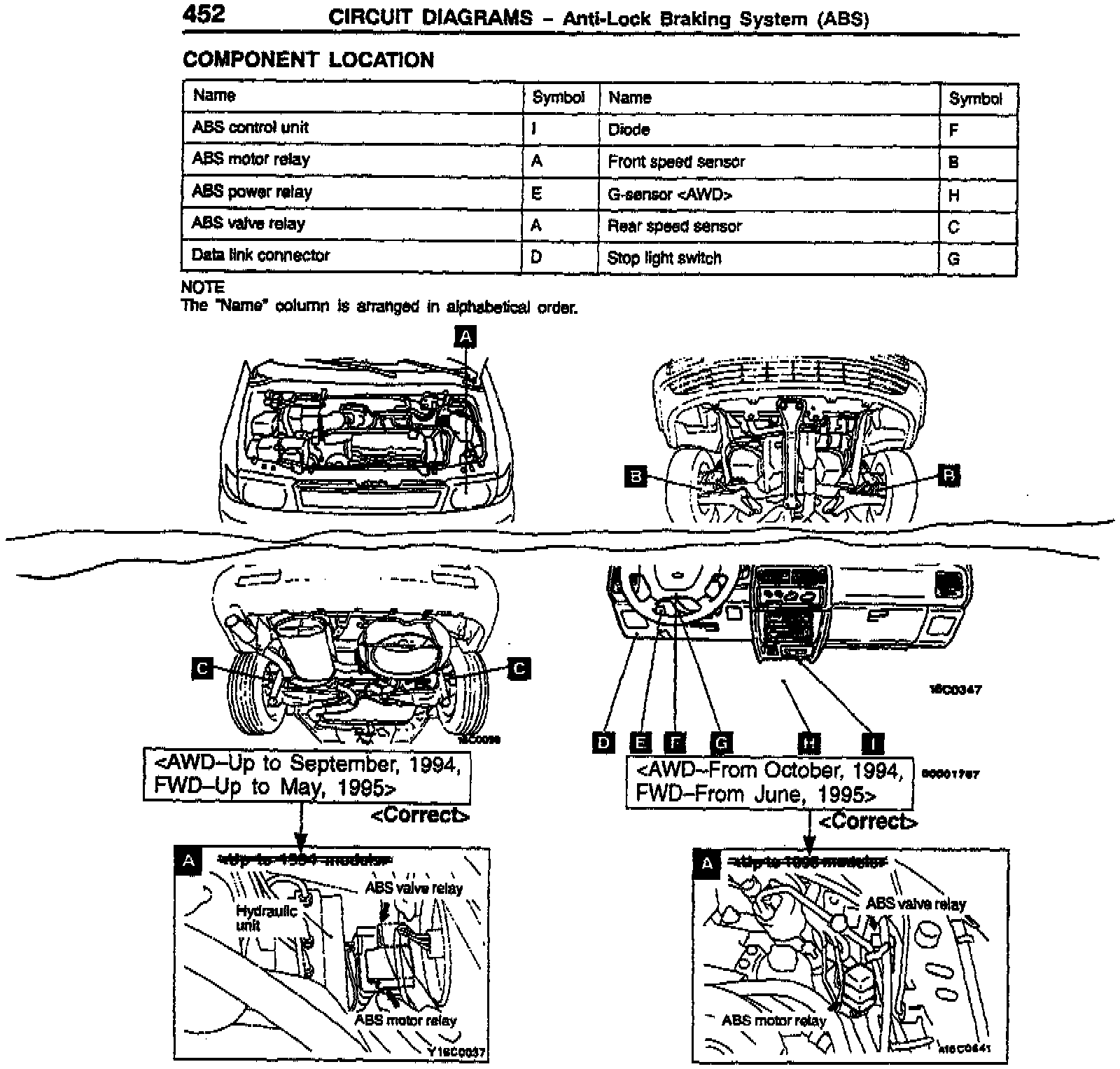 Correct the existing illustration "B" for the ABS Valve Relay and Motor Relay to include vehicles built up to September, 1994 and FWD vehicles built up to May, 1995. Add an illustration to show locations for the ABS Valve Relay and Motor Relay on AWD vehicles from October 1994 and FWD vehicles from June, 1995: