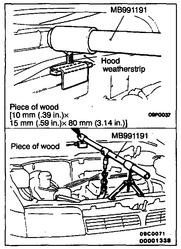 CAUTION: Be sure to insert a piece of wood between engine hanger assembly support and front deck. Make sure that the hood weatherstrip is not caught between the front deck and the piece of wood.