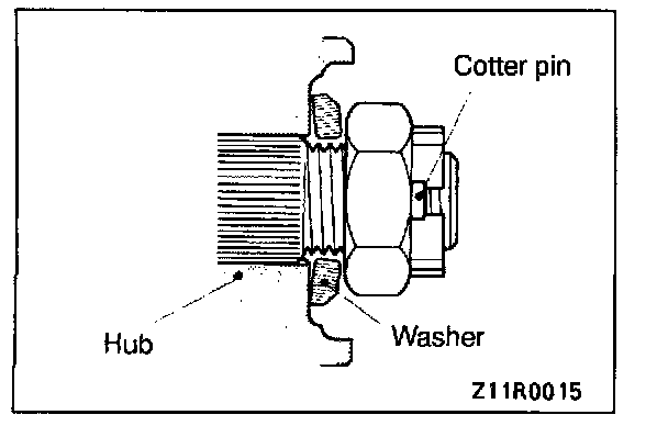 3. If the position of the cotter pin holes does not match, tighten the nut up to 260 Nm (188 ft-lbs.) in maximum.