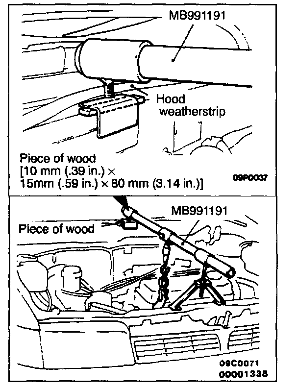 CAUTION: Be sure to insert a piece of wood between engine hanger assembly support and front deck. Make sure that the hood weatherstrip is not caught between the front deck and the piece of wood.