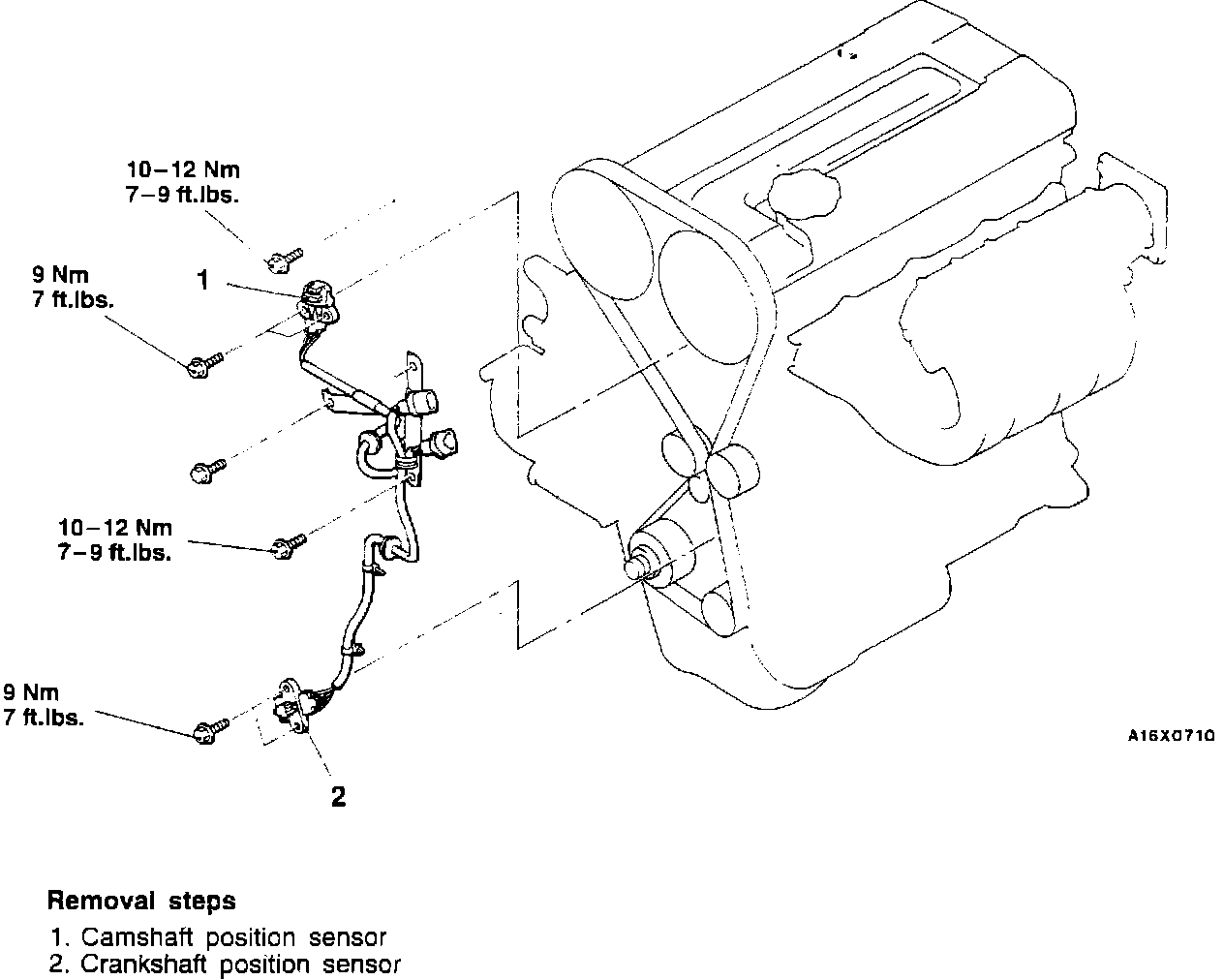 The sensors are bolted to the engine under the timing covers. Refer to Engine/Timing Components/Timing Belt/Service and Repair for removal and installation procedures.