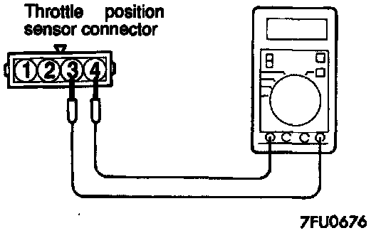 2. Check the continuity between the throttle position sensor connector side terminal 3 and terminal 4. With the accelerator pedal depressed, there should be no continuity. With the accelerator pedal released, there should be continuity.