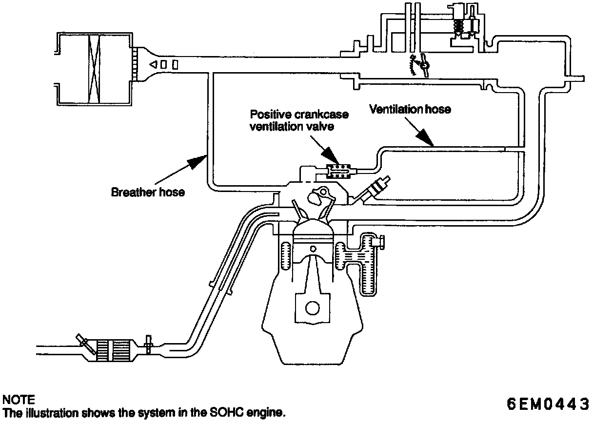 The positive crankcase ventilation system is a system for preventing the escape of blow-by gases from inside the crankcase into the atmosphere. Fresh air is sent from the air cleaner into the crankcase through the breather hose to be mixed with the blow-by gases inside the crankcase. The blow-by gas inside the crankcase is drawn into the intake manifold through the positive crankcase ventilation valve.