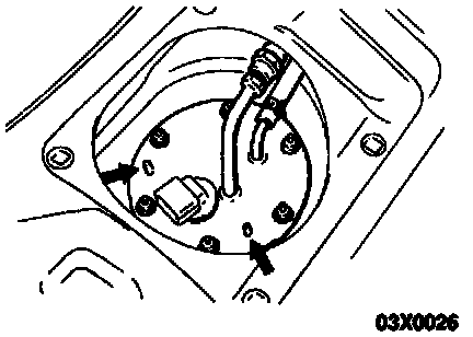 NOTE: As there is a reservoir cap inside the fuel tank, if the fuel gauge unit and pump assembly is tilted to the right and inserted, the fuel gauge unit and pump assembly will touch the reservoir cap.