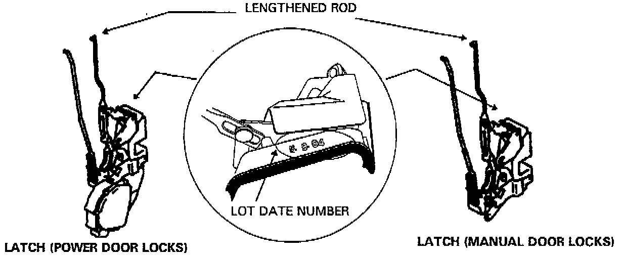 2. Inspect the lot date number on the door latch. The lot date number is stamped on the top edge of the white plastic main latch housing, just outside the black foam latch mounting gasket. If the lot date is 5 8 06 or before, replace the door latch with a new latch having lot date 5 8 07 or later. Refer to the lot date number decoder to determine if a latch is the old or new style.