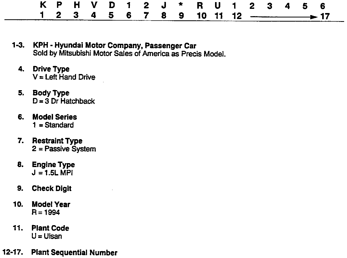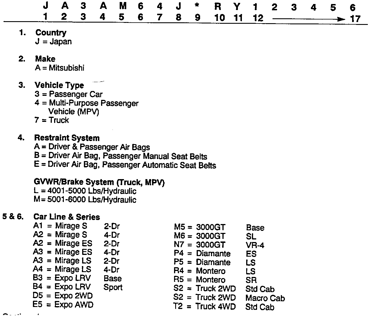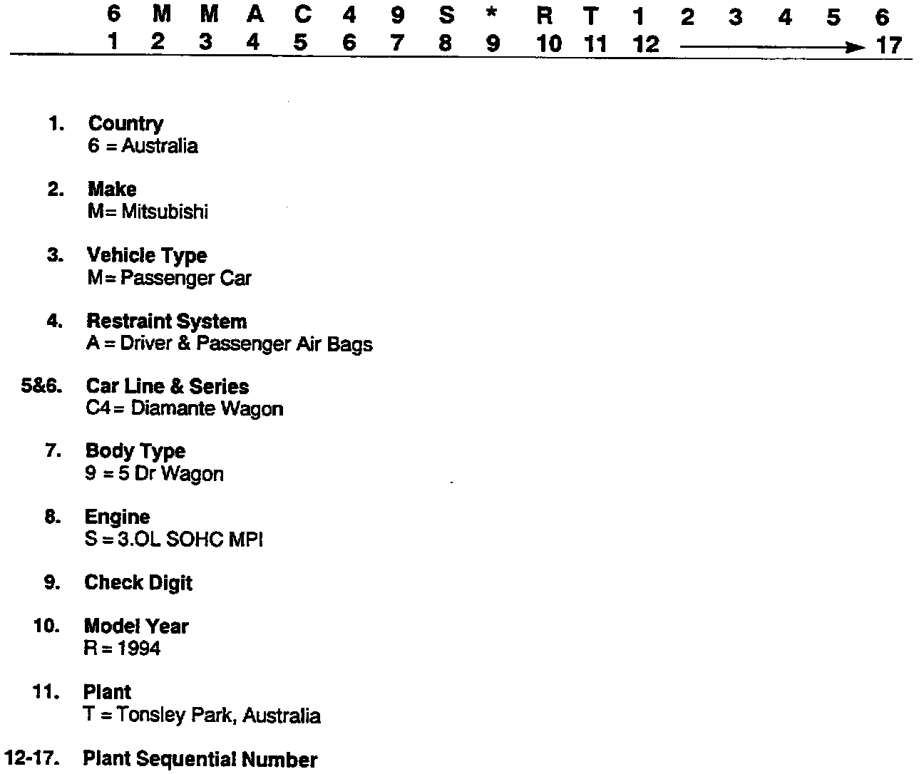This bulletin contains information to decode the Vehicle Identification Numbers on all 1994 MMSA cars & trucks. For VIN information on 1983-1992 vehicles, refer to TSB-92-00-005. And for VIN information on 1993 vehicles, refer to TSB-92-00-004.