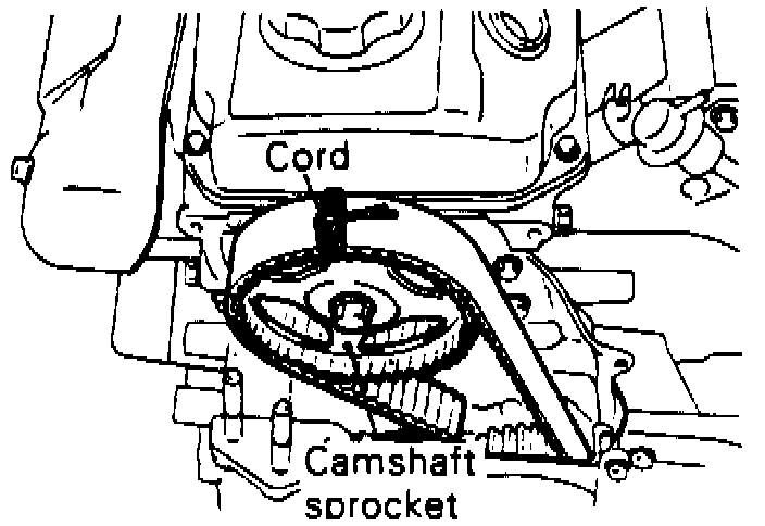 b. Tie camshaft sprocket and timing belt together so that position of camshaft sprocket will not move with respect to timing belt, Fig. 7.