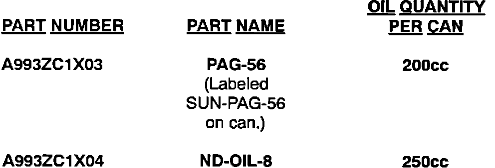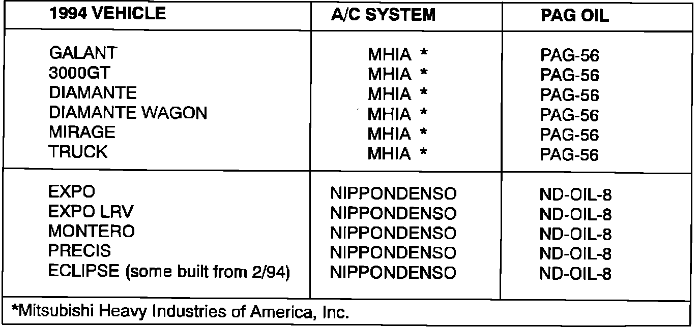 1994 MMSA vehicles equipped with R134a A/C systems use one of two types of PAG oil, depending on the type of system installed. Because these two PAG oils ARE NOT compatible, it is important to know which PAG oil is used in which A/C system. Refer to the application chart.