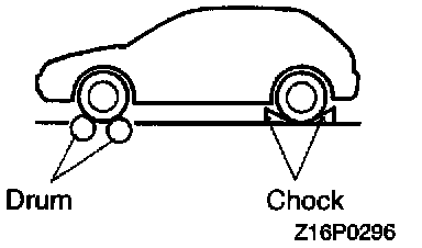 2. When placing the vehicle on a speedometer tester drum, make sure the center line of the vehicle is at right angles to the center line of the drum. Also, make sure the drum is positioned so as to center between the front tires.